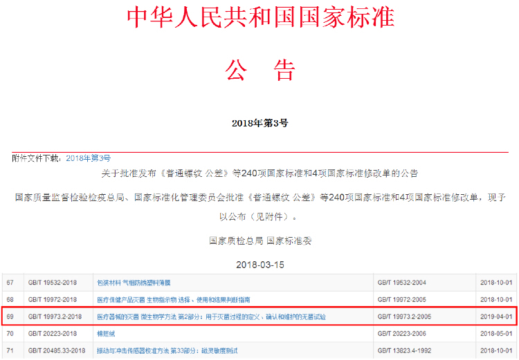 3月15日,國家質(zhì)量監(jiān)督檢驗(yàn)檢疫總局、國家標(biāo)準(zhǔn)化管理委員會(huì)發(fā)布2018年第3號(hào)中國國家標(biāo)準(zhǔn)公告,對新一批國家標(biāo)準(zhǔn)予以公布,其中包括了由泰林生物為第一起草單位的國家標(biāo)準(zhǔn)《醫(yī)療器械的滅菌 微生物學(xué)方法 第2部分:用于滅菌過程的定義、確認(rèn)和維護(hù)的無菌試驗(yàn)》。